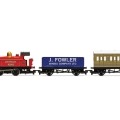 1 x Model Steam Locomotive, 1 x Coach, 1x Wagon, 1 x 3rd Radius Starter Oval Track, 1x DC Train Controller (R7229), 1 x Wall Plug Transformer (P9000W), 1 x Power Connecting Track (R8206), 1 x Hornby MidiMat (1600 x 1180mm), 1x Rerailer, 1 x Accessory Pack (includes fireman and driver figures and vacuum pipes), 1x Instructions